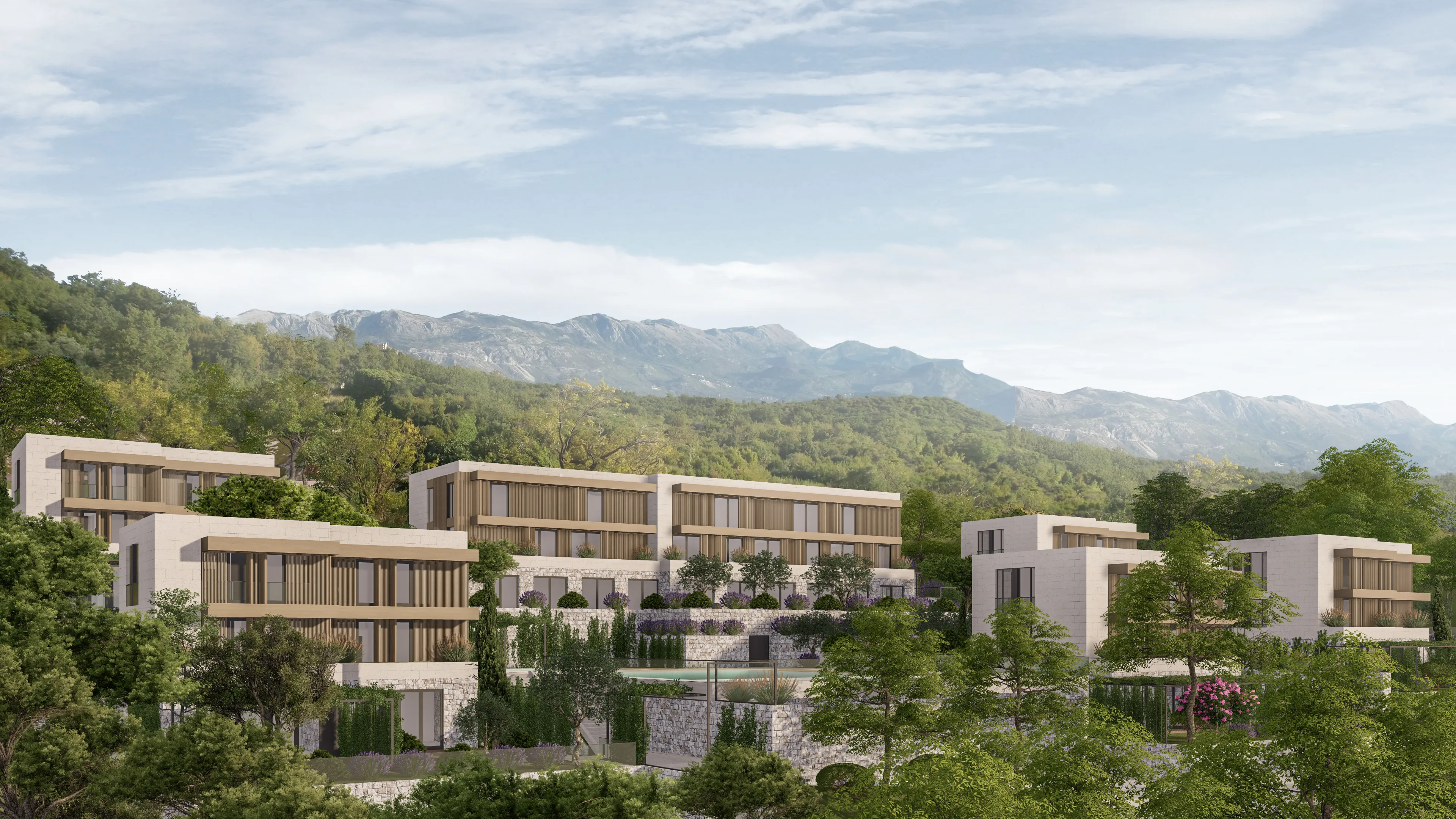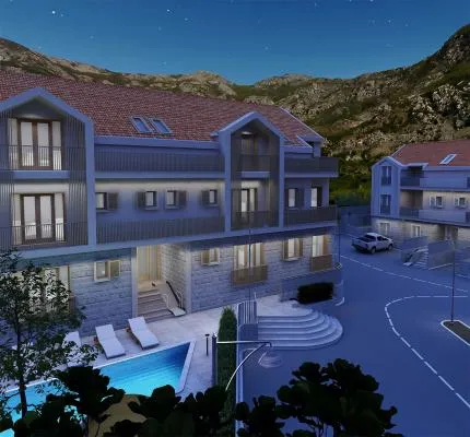Introducing Kotor Bay project, a new residential complex nestled in a pristine natural setting near the sea, offering stunning views of the Montenegrin coast. With 32 modern, high-quality apartments, including 30 one-bedroom and 2 two-bedroom units, the complex features a smart home system, a swimming pool, wellness center, playground, and 25 parking spaces. The design blends traditional stone and wood materials, ensuring comfort, security, and energy efficiency for a luxurious lifestyle