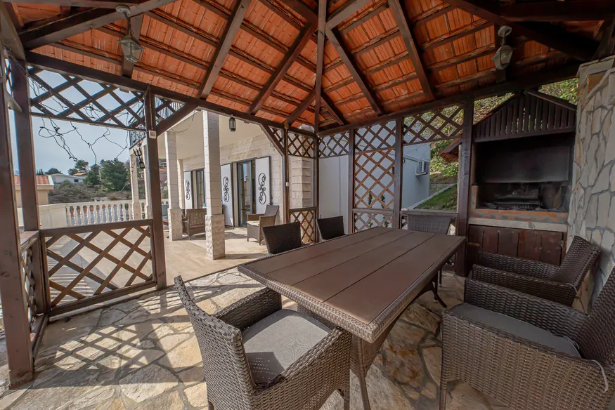 On the second floor there are two bedrooms, a bathroom, a living room with a kitchen and access to a terrace and a gazebo with a barbecue.