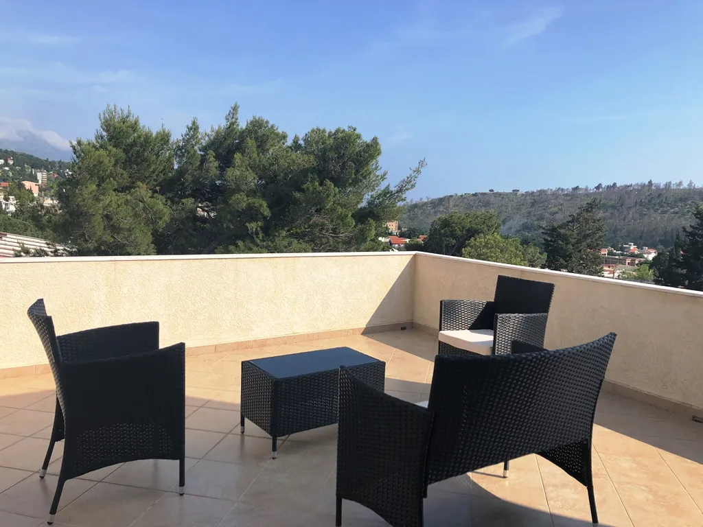 Layout of the apartment: spacious living room combined with kitchen and dining room, three bedrooms, two bathrooms and terrace. The terrace has an area of 40m2 and offers a view of the city and the mountains. The apartment is fully furnished and equipped. There is an air conditioner in the living room.