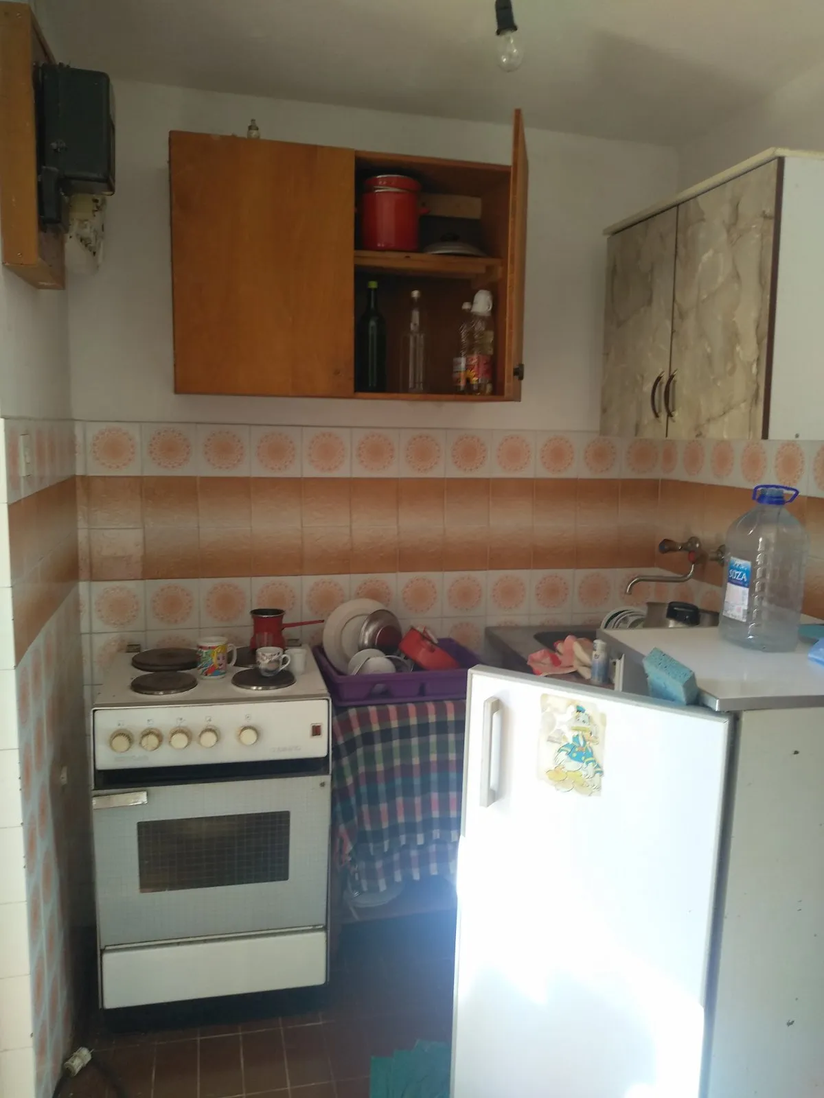 Layout of the house on the first floor: kitchen combined with living room, one bedroom, bathroom and terrace.