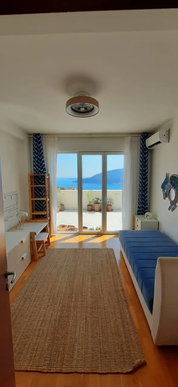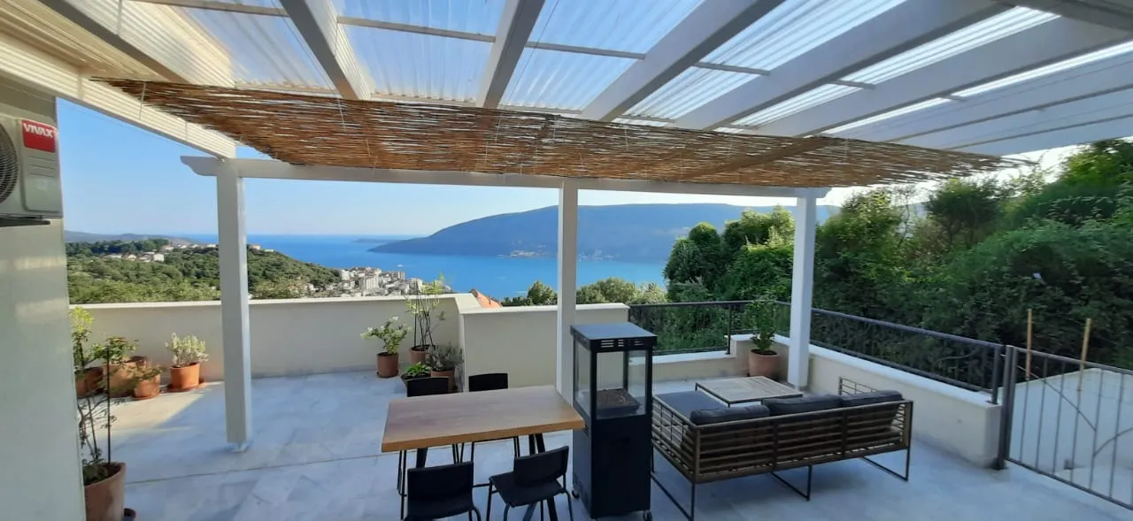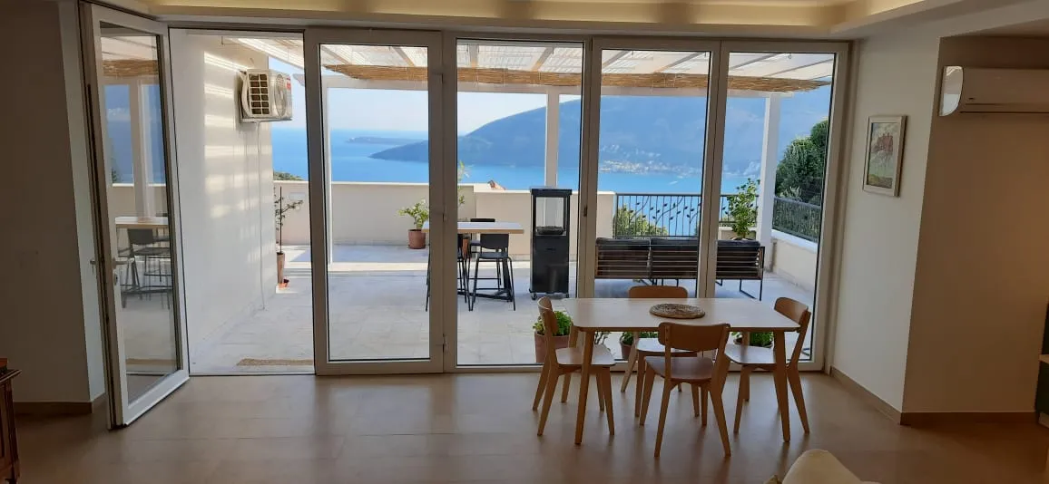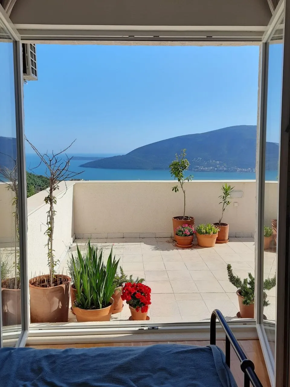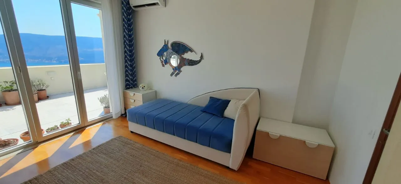 An apartment with an area of 173 m² offers a spacious terrace with a fantastic view of the bay, Mount Lovćen, and the open sea. It features three separate bedrooms, two modern bathrooms, a spacious living room with a kitchen, a walk-in closet, and two storage rooms.