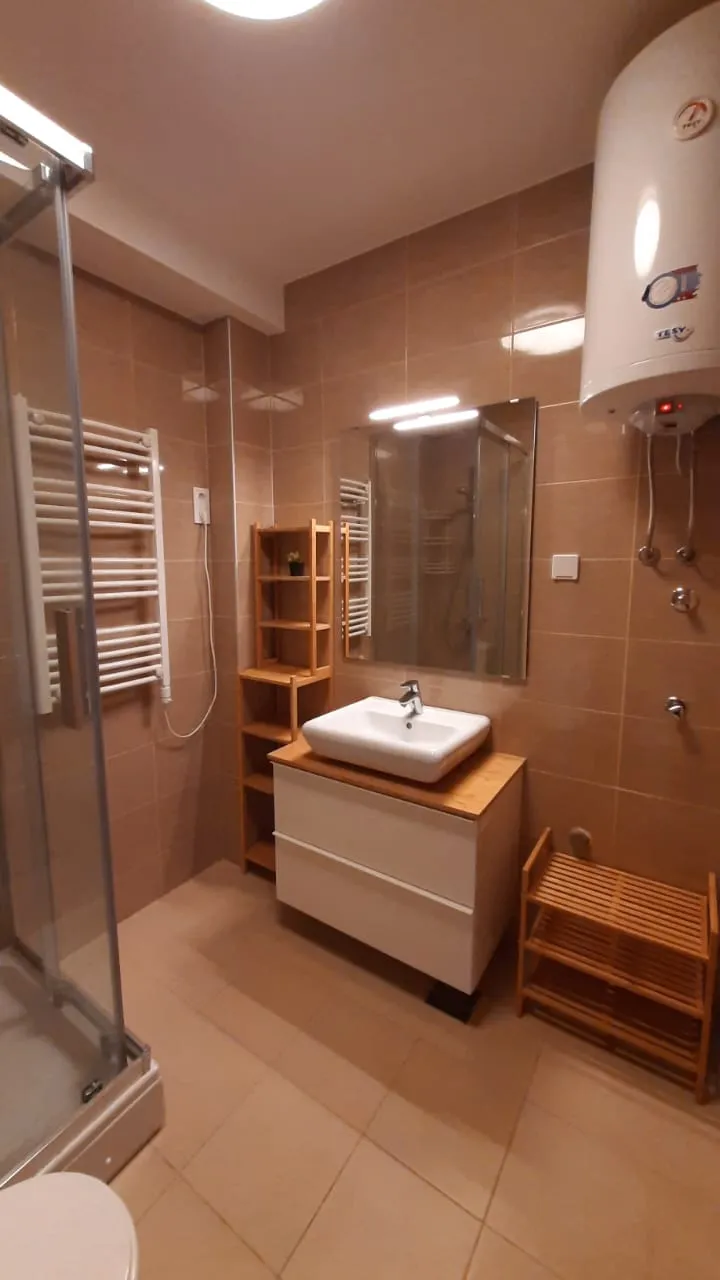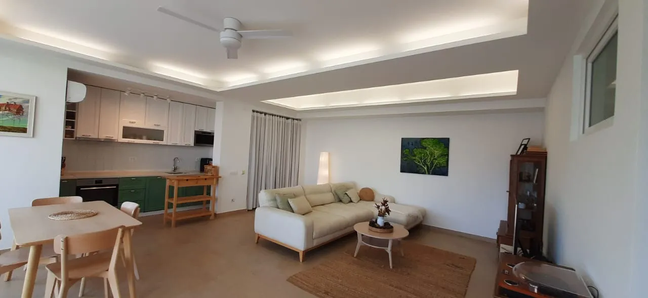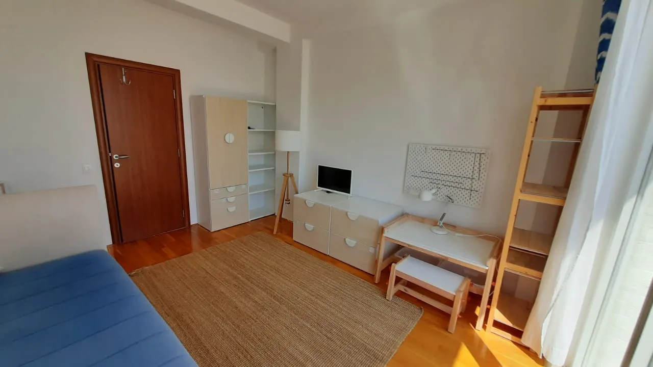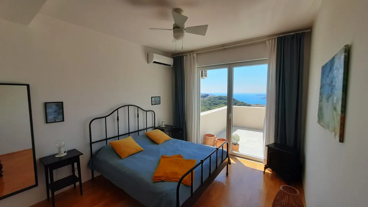 An apartment with an area of 173 m² offers a spacious terrace with a fantastic view of the bay, Mount Lovćen, and the open sea. It features three separate bedrooms, two modern bathrooms, a spacious living room with a kitchen, a walk-in closet, and two storage rooms.