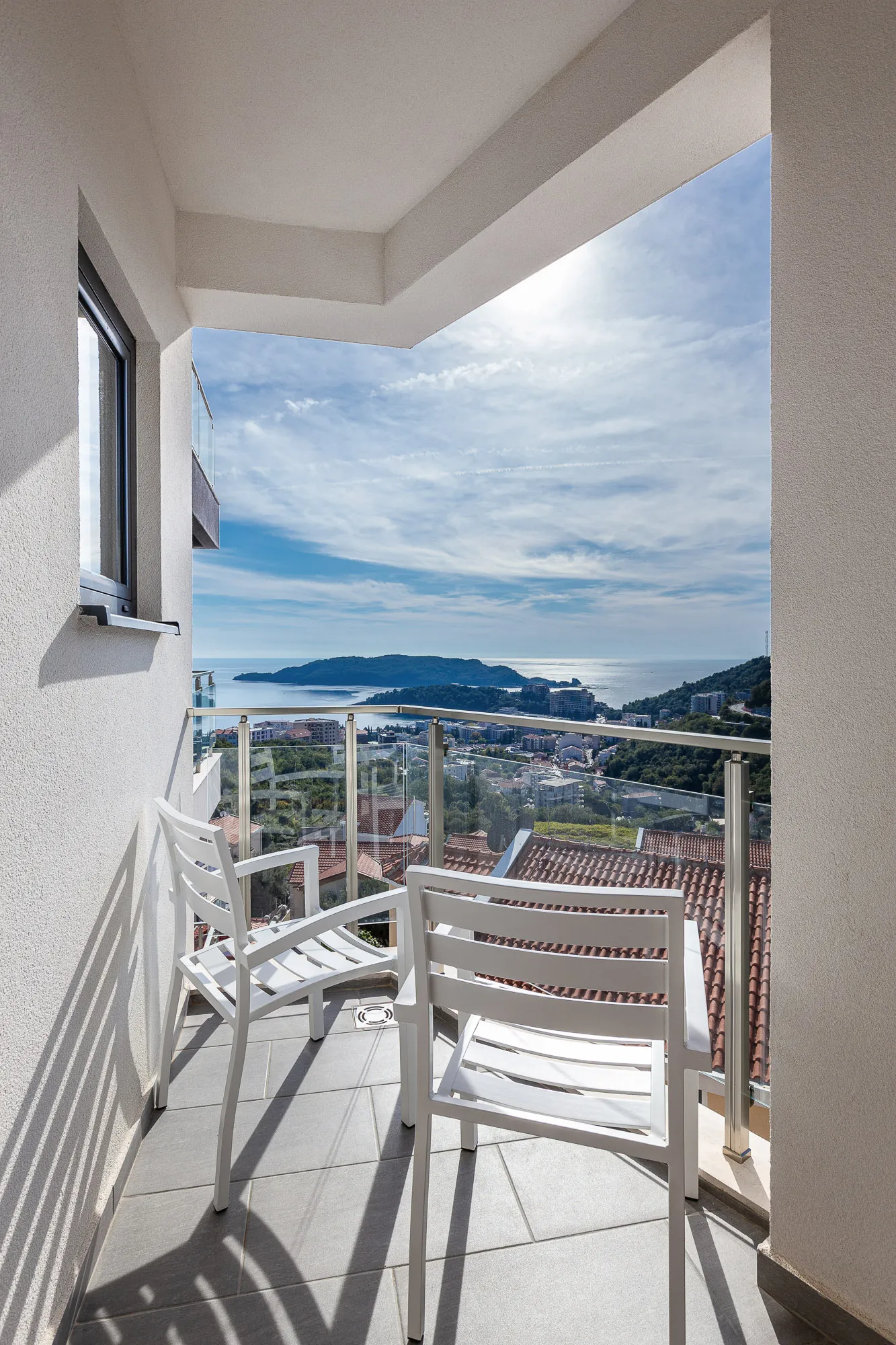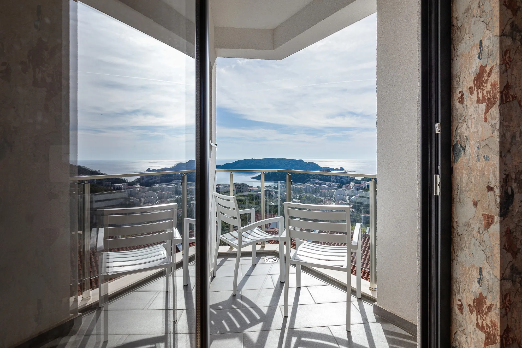 Aufteilung der Wohnung: Wohnzimmer mit Esszimmer kombiniert mit offener Küche, Badezimmer und großem Balkon. Die Wohnung ist möbliert und ausgestattet und wird mit allen Möbeln verkauft. Die Terrasse bietet einen Blick auf die Stadt und das Meer in der Ferne.