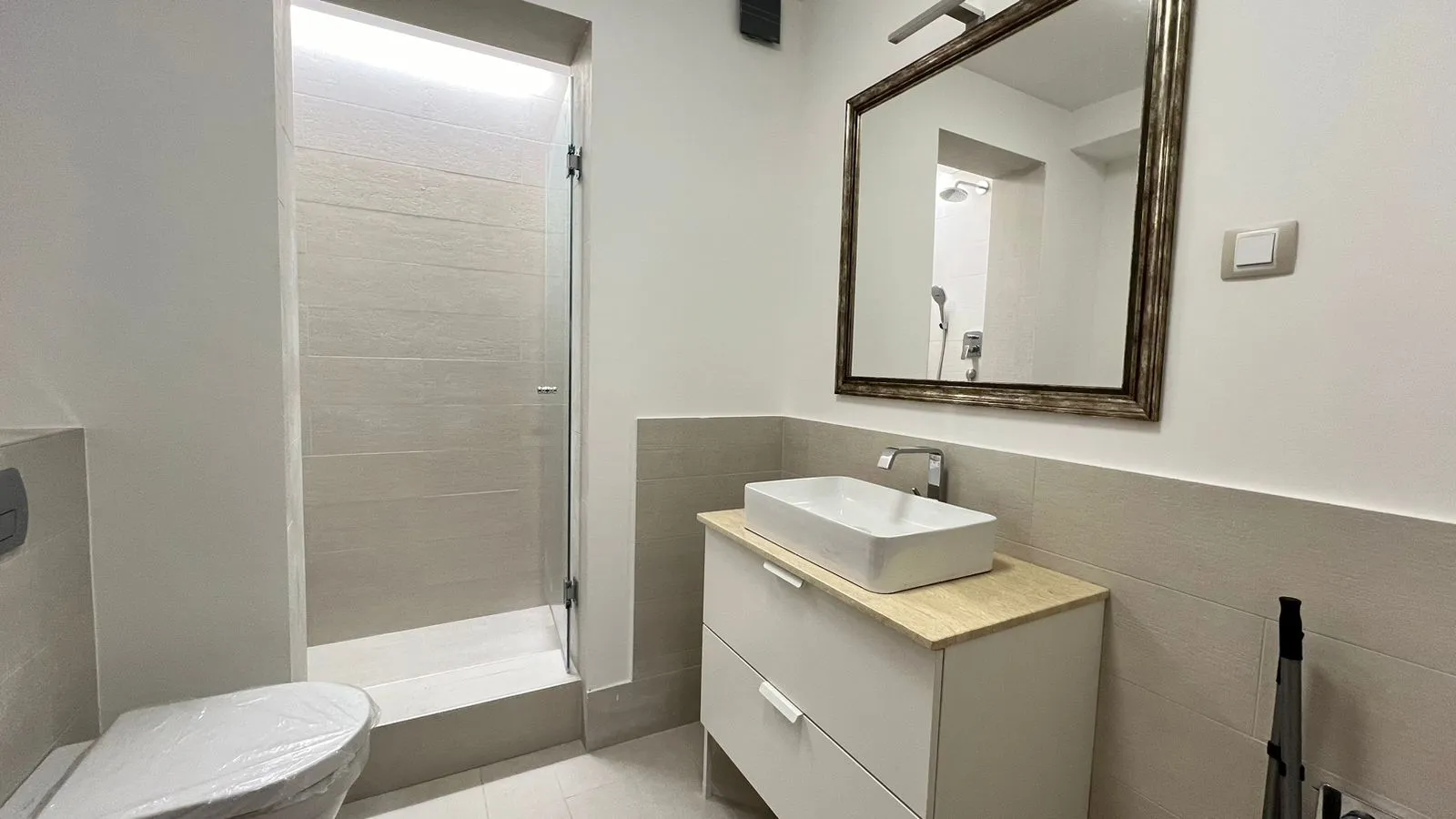 Lower level: hallway with furnished entrance, spacious bathroom, living room with kitchen and dining room and terrace with a view of the city park, Porto Montenegro, the sea.