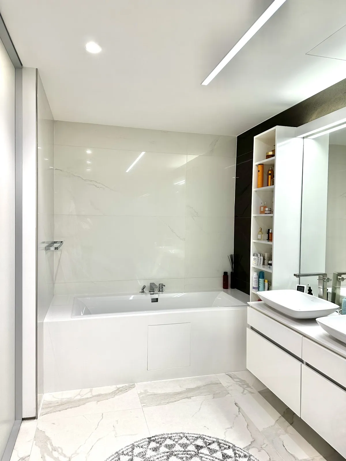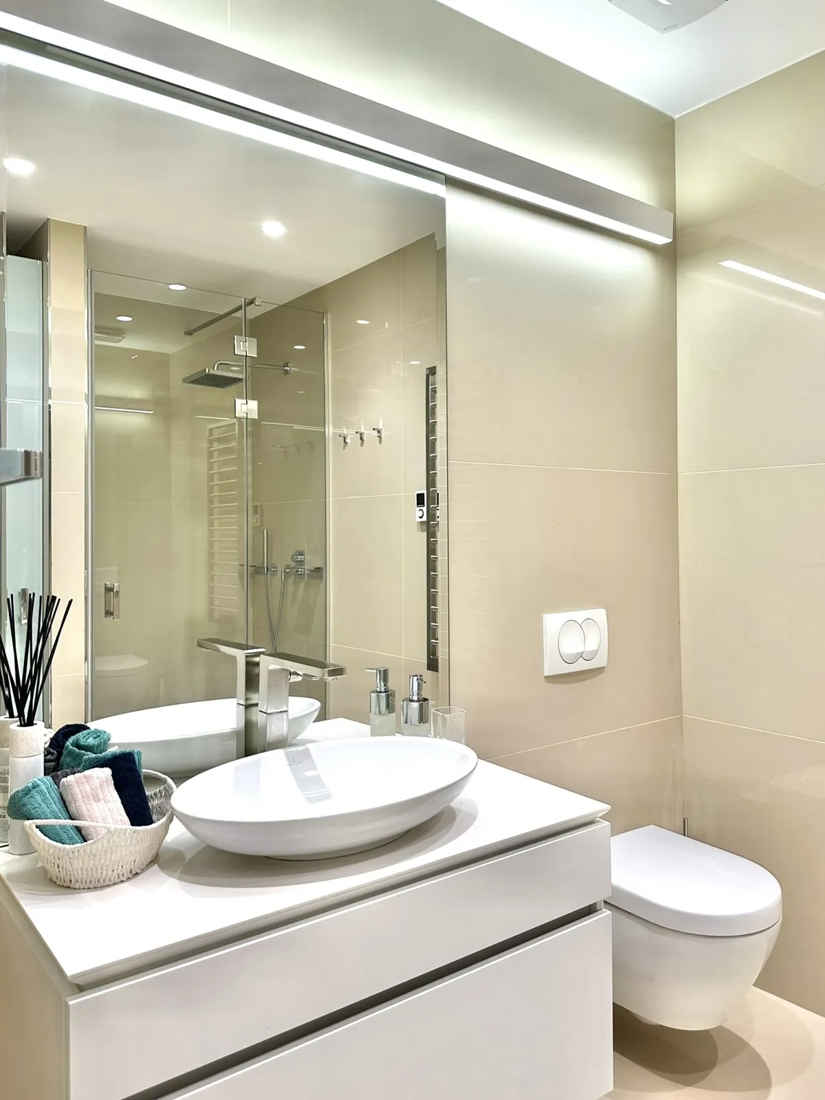Планировка квартиры: гостиная со столовой, совмещенная с открытой кухней, две спальни, 2 ванные комнаты и просторная терраса. Квартира меблирована и оборудована, продается со всей мебелью. С террасы открывается вид на море и город.