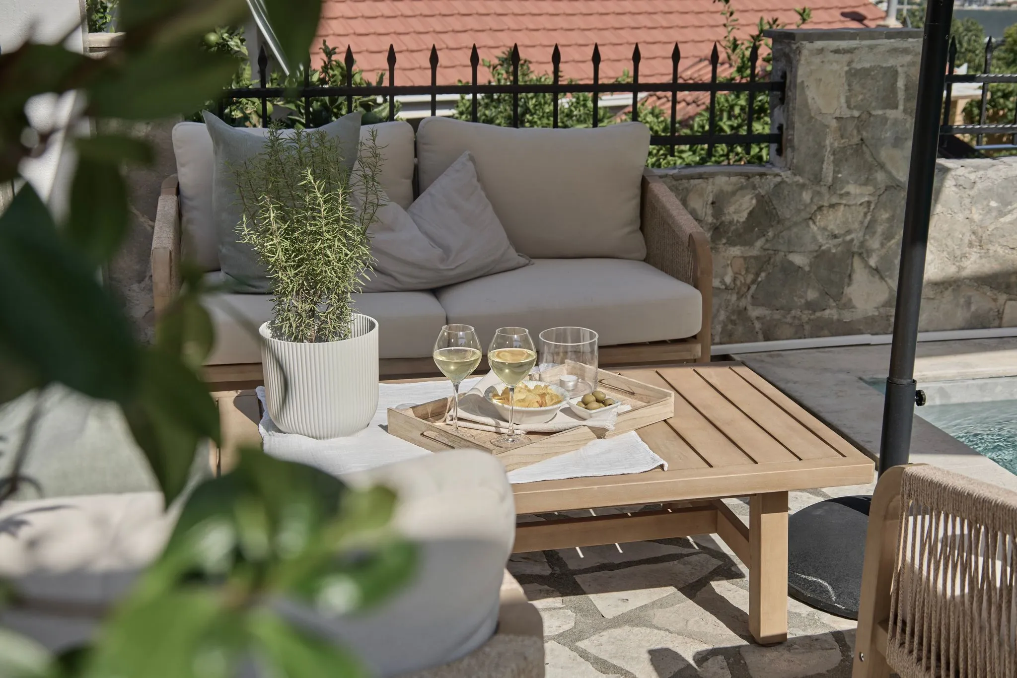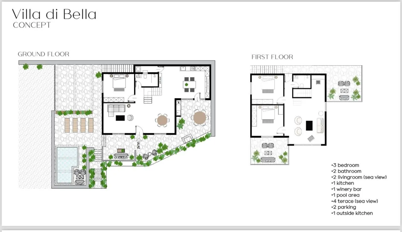 Die Villa verfügt über drei geräumige Schlafzimmer, zwei moderne Bäder, zwei Wohnzimmer mit herrlichem Meerblick und eine voll ausgestattete Küche. Neben dem Hauptbereich verfügt die Villa auch über eine Weinbar, eine Außenküche und einen wunderschön angelegten Garten mit Poolbereich, ideal zum Entspannen und Genießen der Privatsphäre. Die Villa hat vier Terrassen mit herrlichem Meerblick.