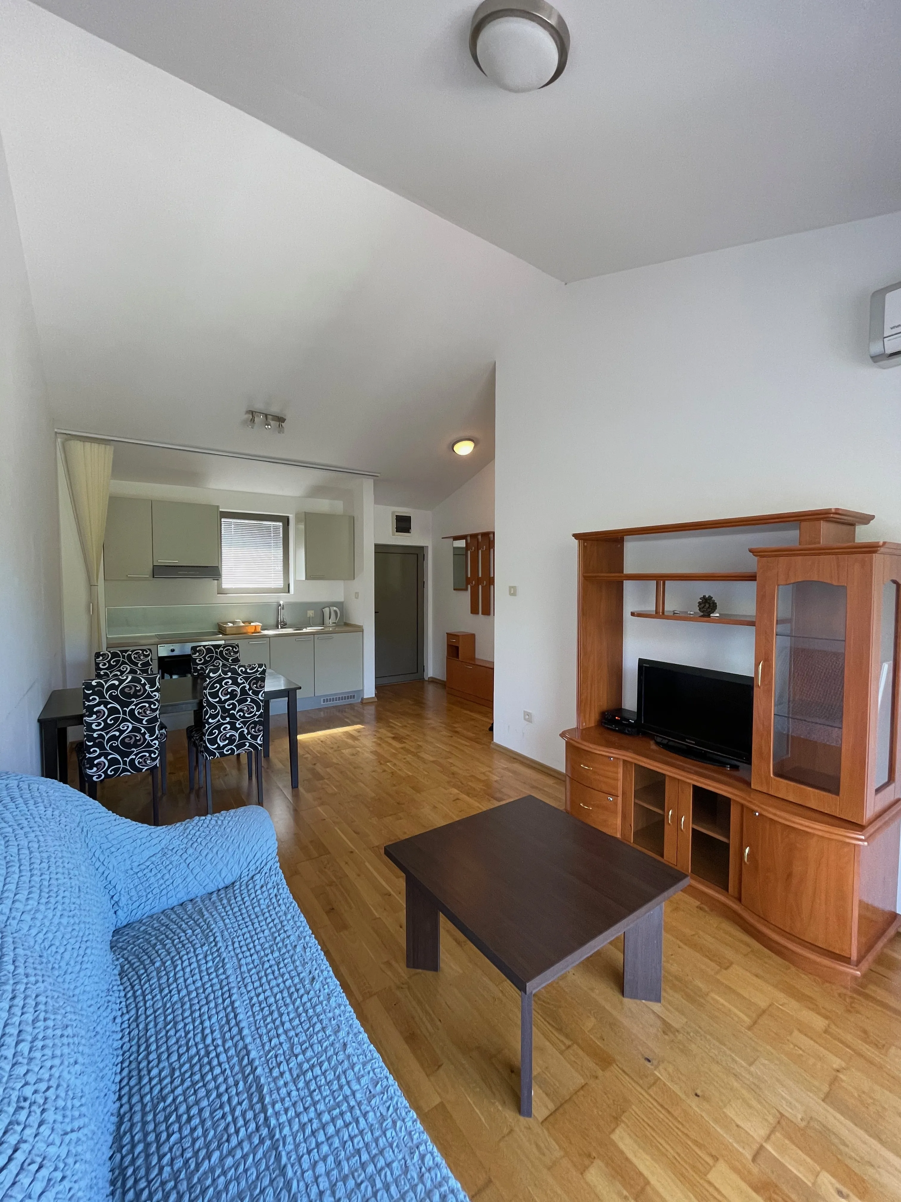 The layout of the apartment: kitchen combined with living room, a bedroom, a bathroom, terrace. The apartment has air conditioners.