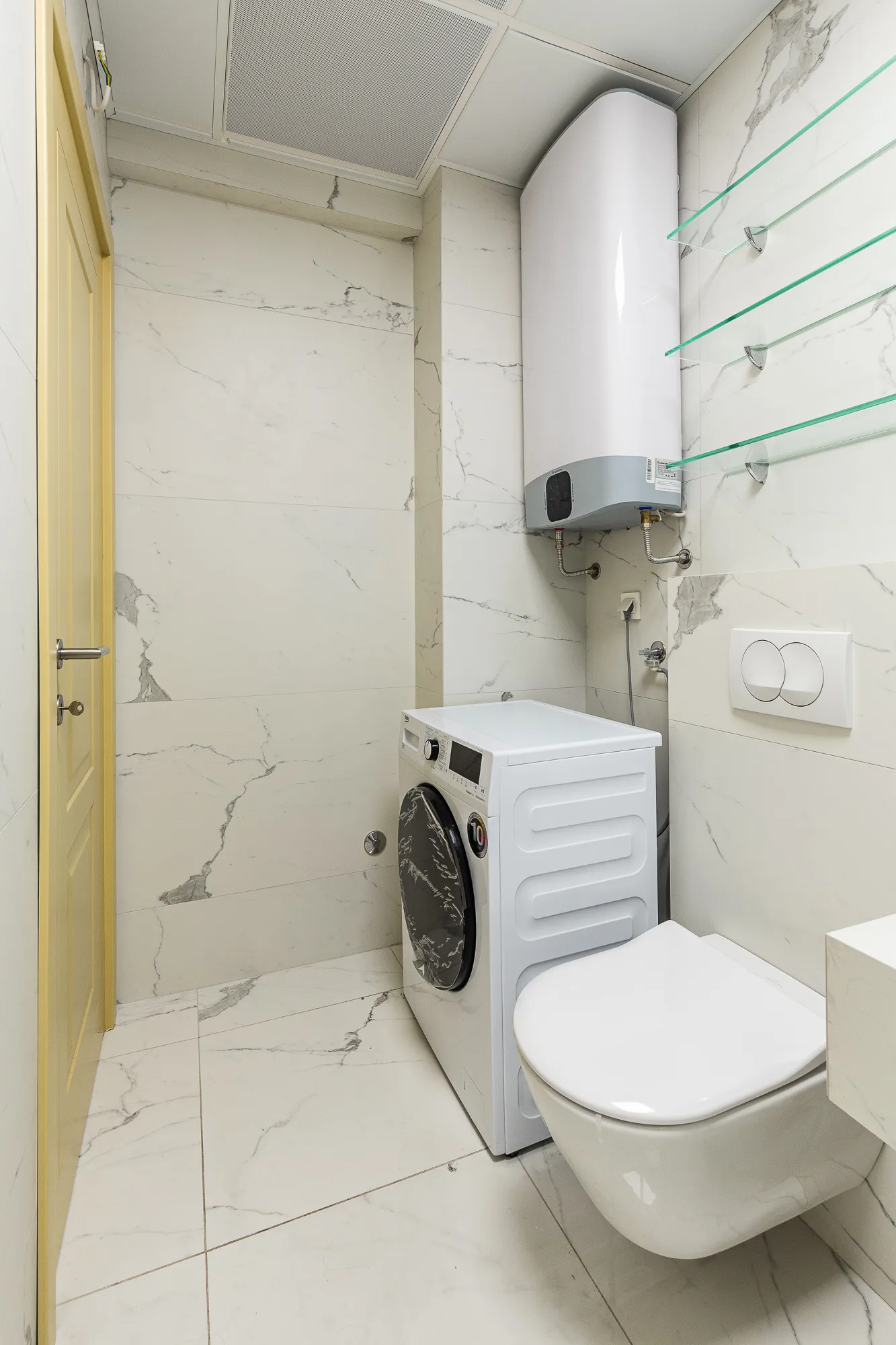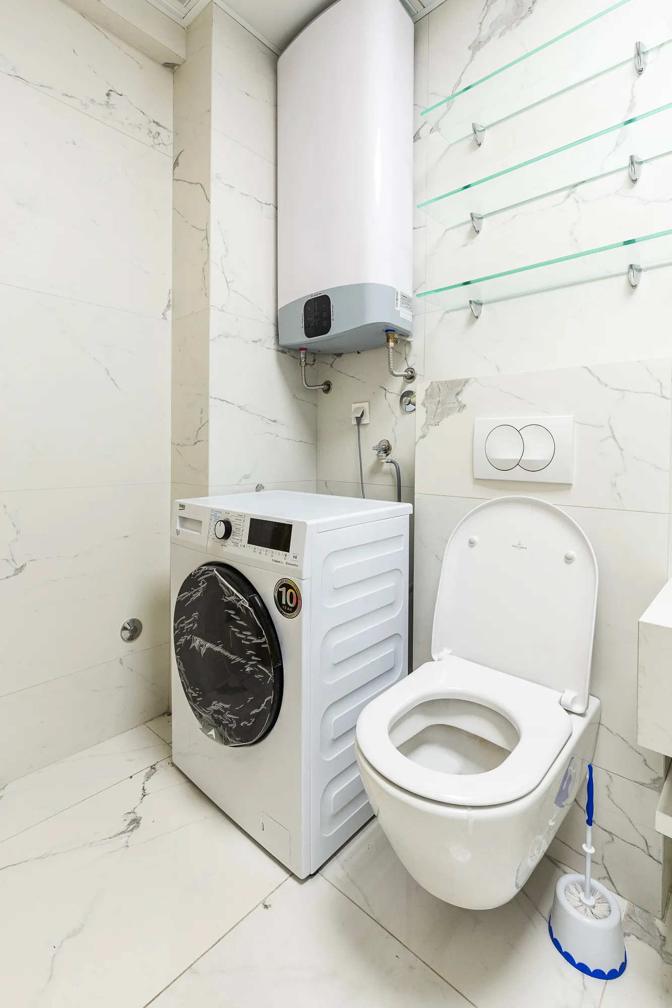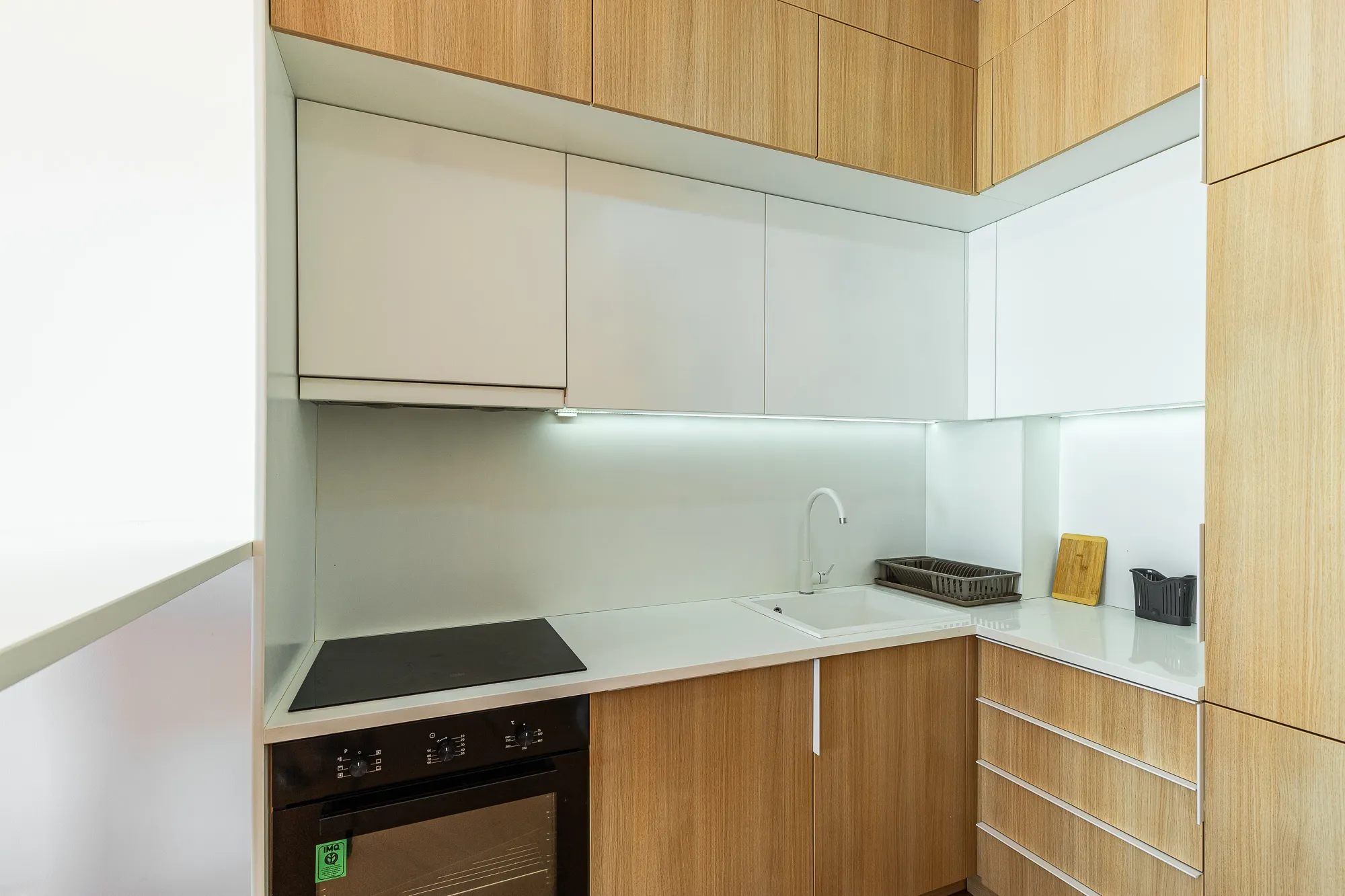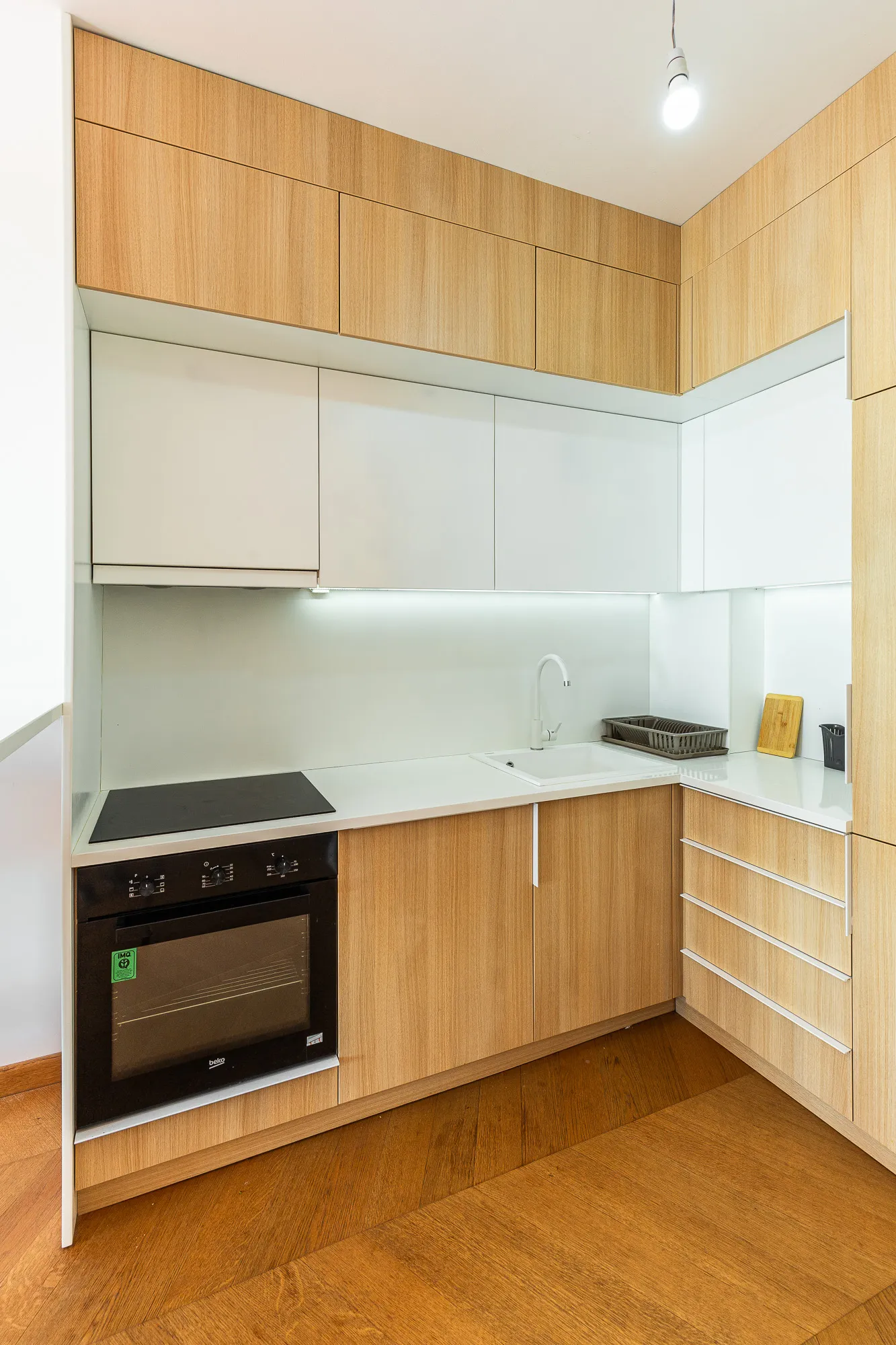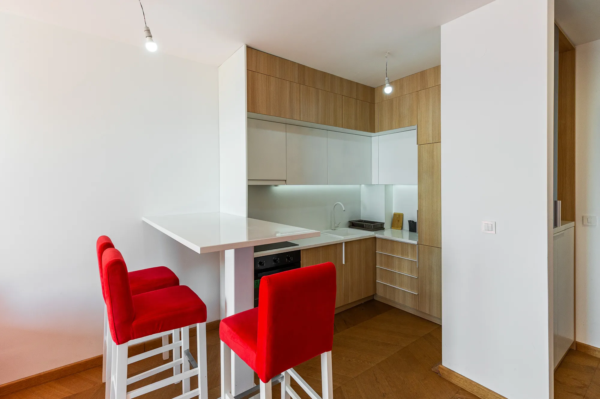 Apartment layout: living room combined with kitchen and dining room, bedroom, bathroom and balcony. The apartment is sold furnished.