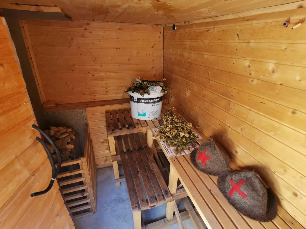 Im ersten Stock gibt es eine Toilette, eine Sauna und eine Küche, die einen idealen Ort zum Entspannen bieten.