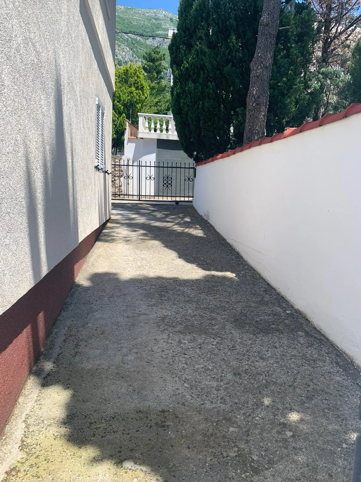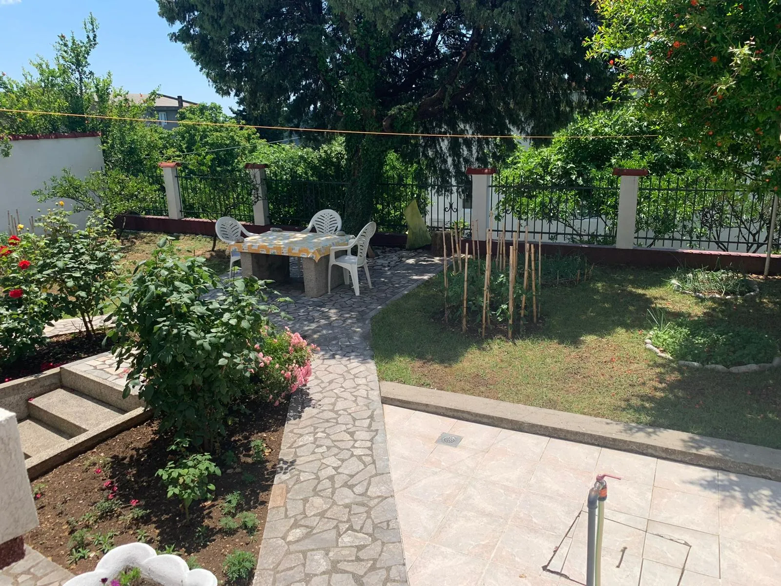 Next to the house in yard is a driveway in the form of a parking space. The yard is paved with a stone path and decorated with a garden as well as a corner for rest in the form of a table with garden chairs, and everything is fenced with a forged gate.