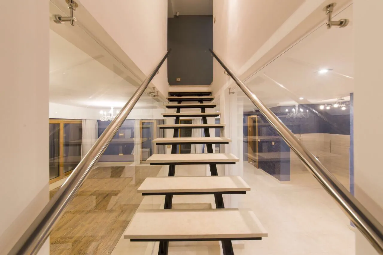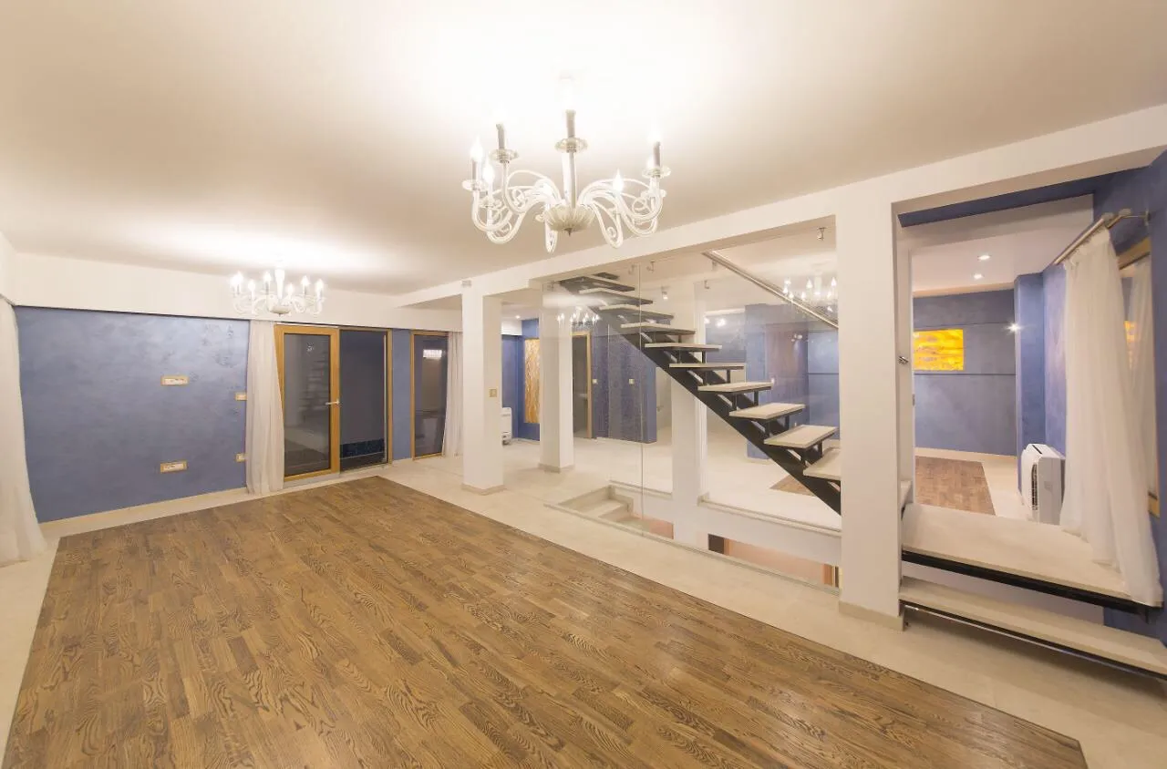 im zweiten Stock gibt es eine Küche kombiniert mit einem Wohnzimmer, ein Badezimmer und eine geräumige Terrasse mit Jacuzzi und Swimmingpool;