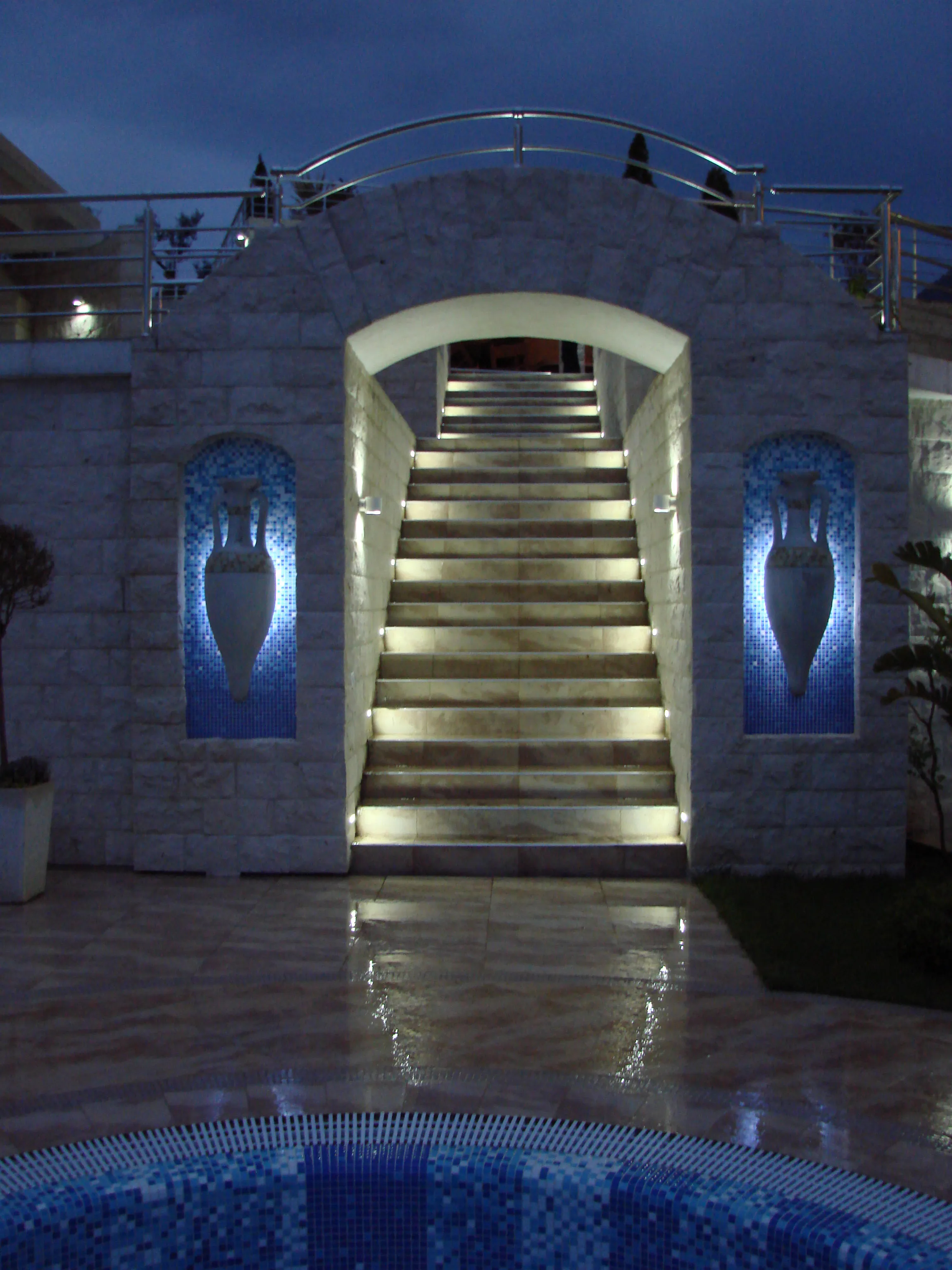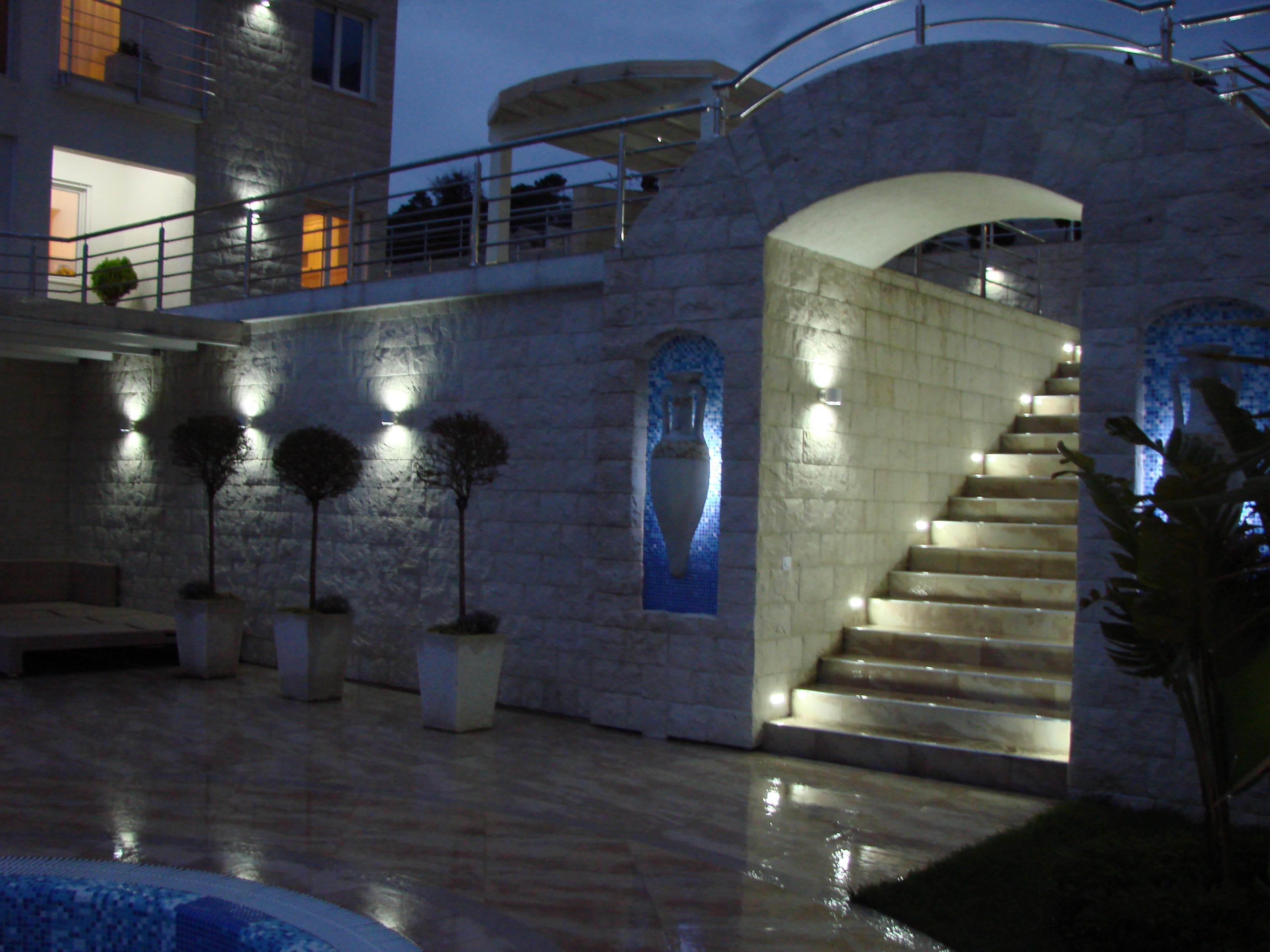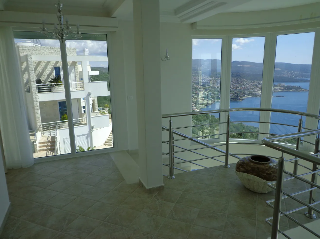 Первая вилла общей площадью 500 м2 имеет четыре этажа каскадной постройки. На -2 этаже находится спальня со своим с/у и с выходом к бассейну. На -1 этаже находится вторая спальня со своим с/у и большая гостиная с камином и витражными окнами. На первом этаже находится третья спальня со своим с/у и с балконом, кухня ( встроенный холодильник, посудомоечная машина, варочная панель и духовой шкаф) и столовая с выходом к мостику, который соединяется со второй виллой. На 2 этаже находится четвёртая спальня со своим с/у и с балконом. Все комнаты светлые и имеют окна до пола, которые дополнительно защищены ставнями. Так же первая вилла имеет большую постирочную-кладовую и гараж на одно машин место.