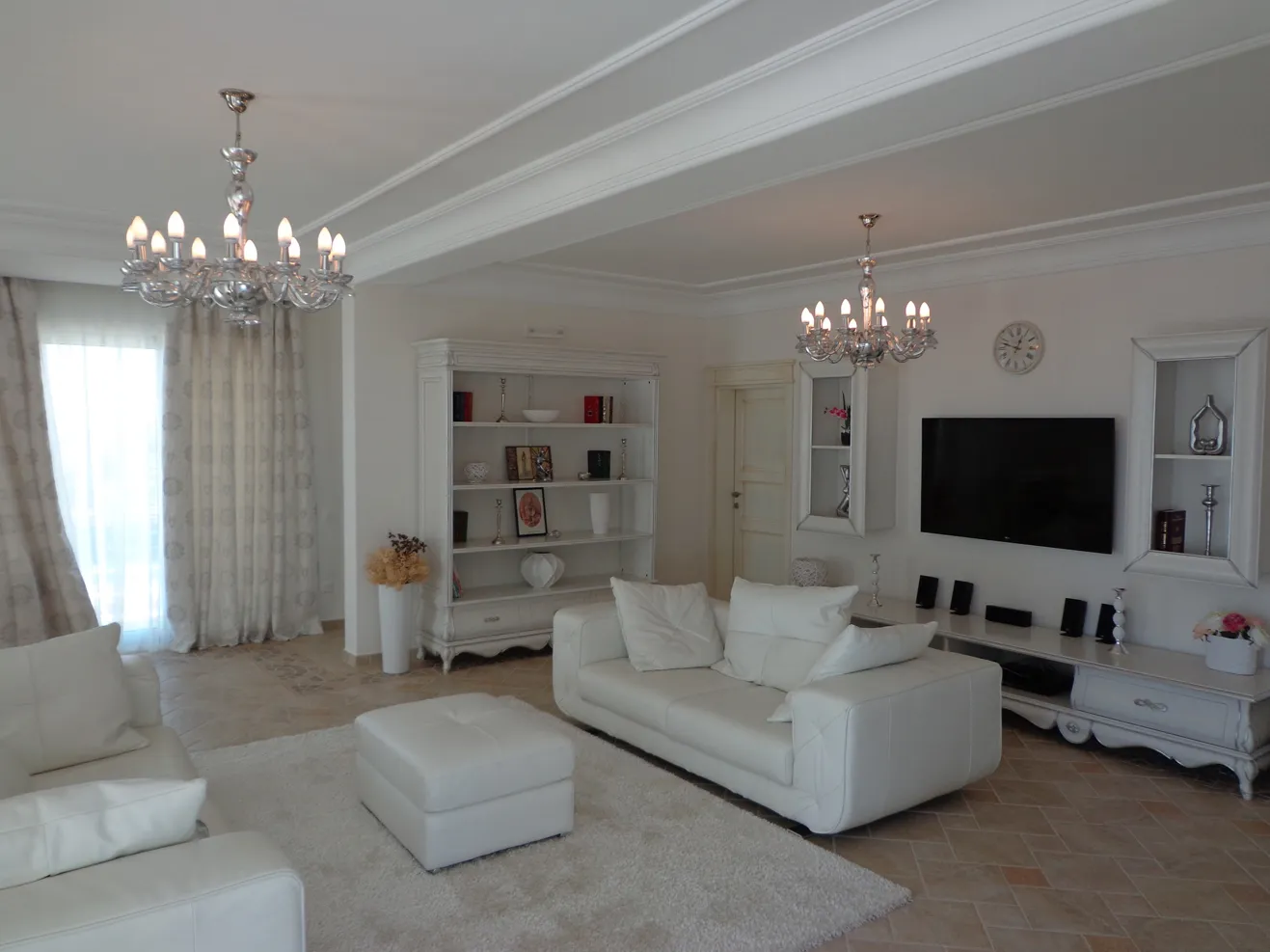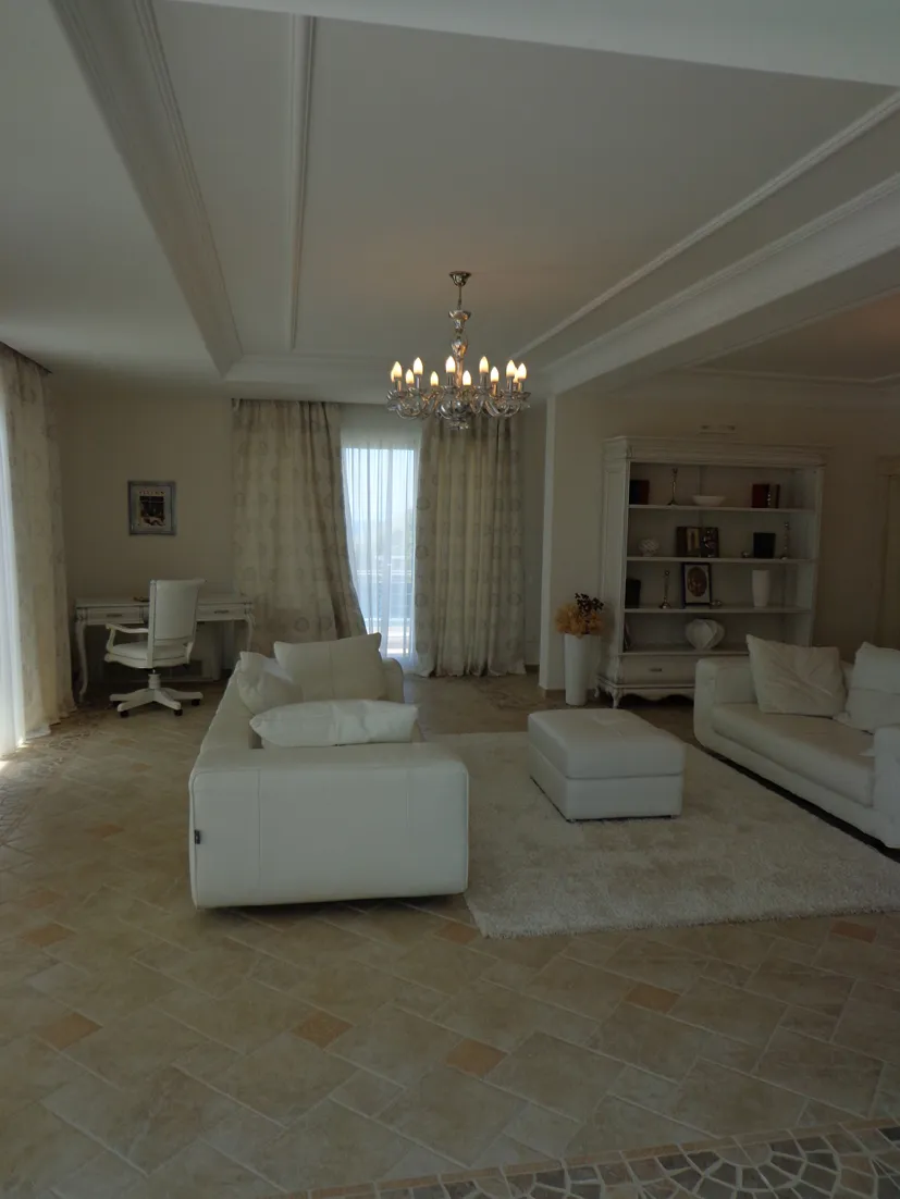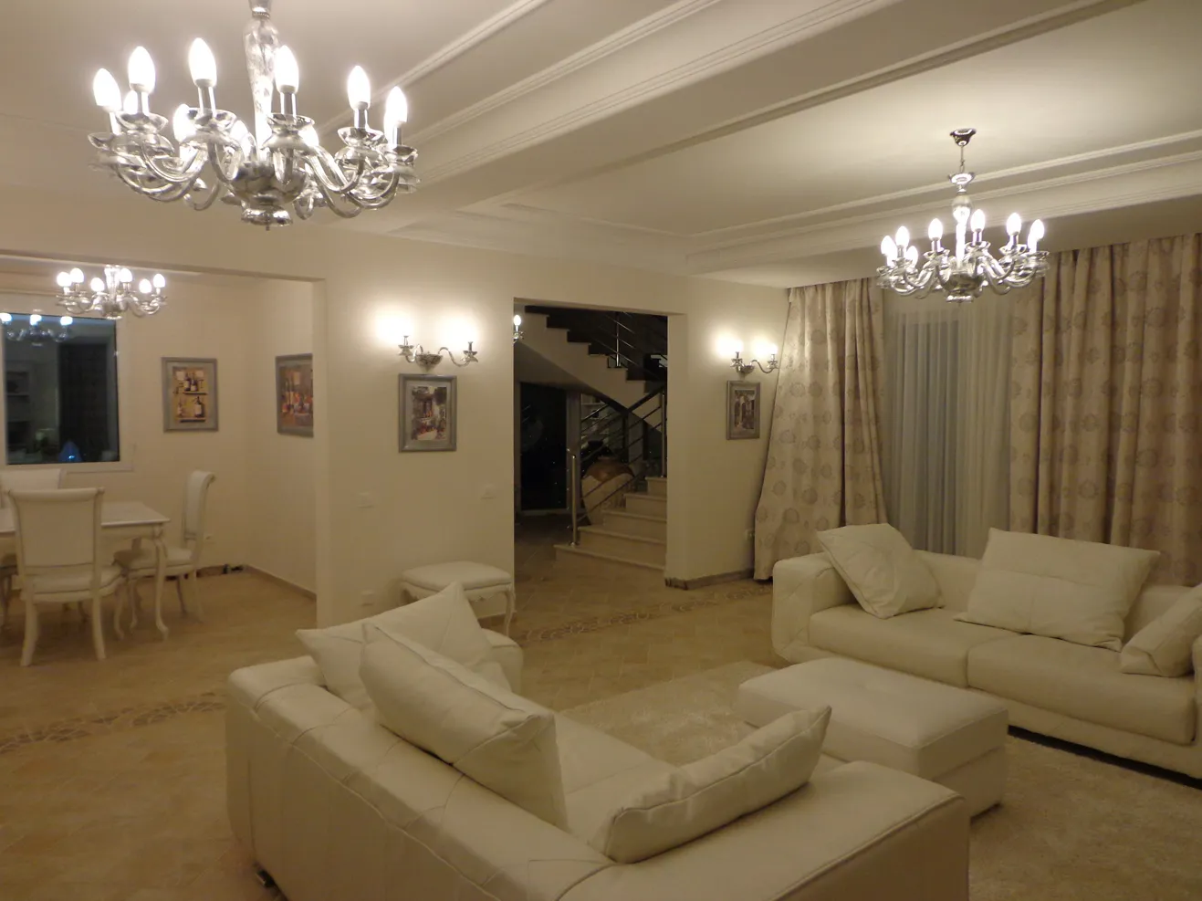 Вторая вилла общей площадью 400 м2 имеет два этажа. На первом этаже находится большая гостиная, кухня-столовая ( встроенный холодильник, посудомоечная машина, варочная панель, духовой шкаф и микроволновая печь), санузел и маленькая спальня на одного человека. На втором этаже виллы расположены две спальни со своими с/у.